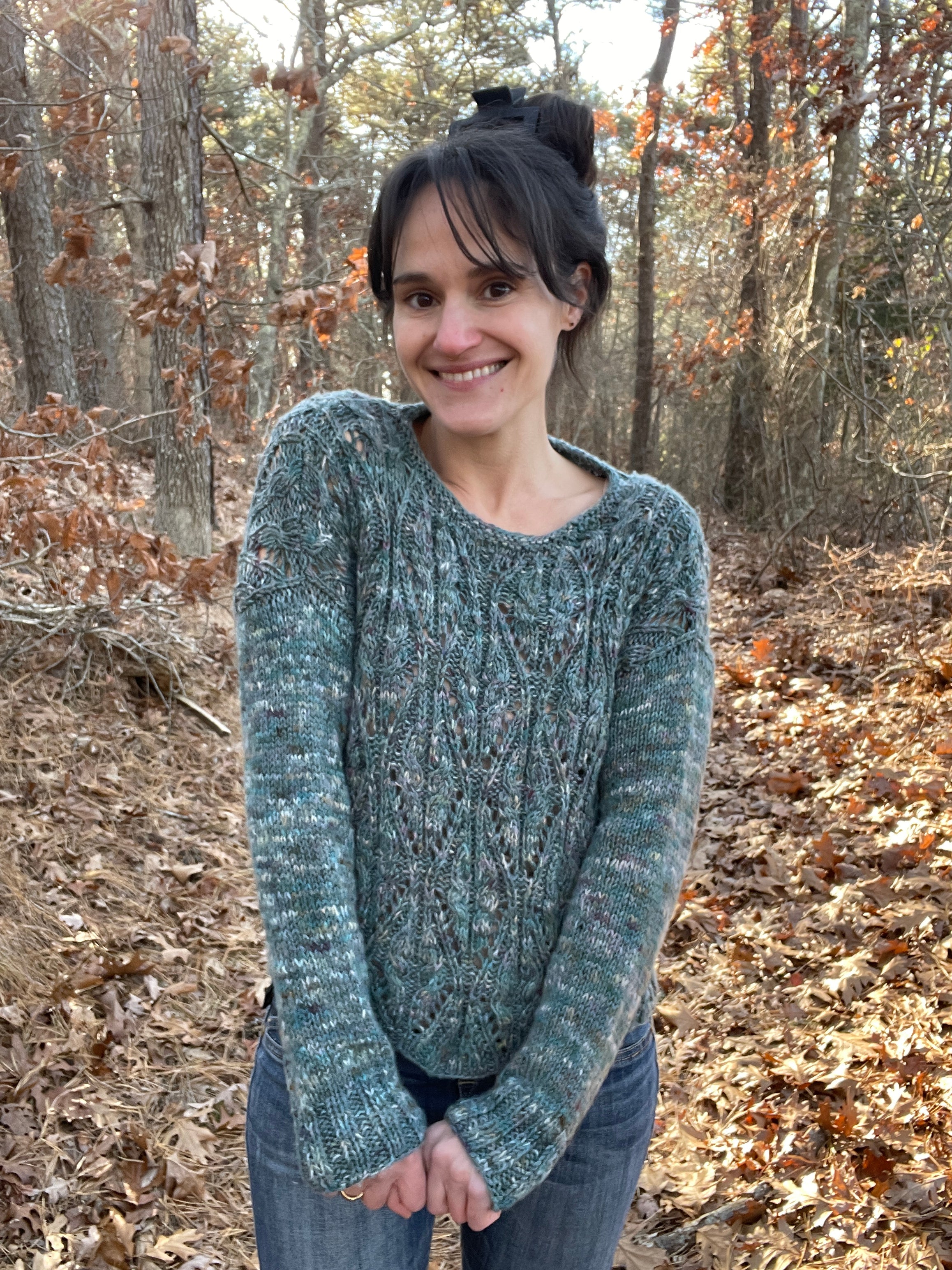 Meandering Paths is knit from the bottom up in the round. The front and back yokes are knit separately, flat, and feature neckline and shoulder shaping. The yoke halves are seamed at the shoulders. Sleeves are picked up and worked in the round outward from the body.